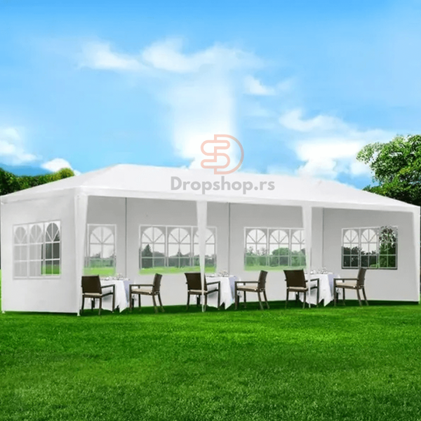 Paviljon tenda sa 6 bočnih panela pravi je izbor ukoliko vam treba zaštita od kiše ili sunca u vašem dvorištu. Praktičan za upotrebu može se lako postaviti i onda razmontirati kada želite da ga odložite. Dimenzije paviljona su 6 x 3 m, visina u najvišem delu je ~250 cm. Paviljon dolazi sa 6 bočnih panela, 4 sa prozorima i 2 bez prozora. Stranice (panele) možete kotistiti po potrebi, jednostavno ih je skinuti ili urolati. Možete sa stranicama napraviti raspored koji Vama odgovara najviše zbog prozora. Ovaj paviljon možete koristiti i za proslave rođendana ili drugih svečanosti.