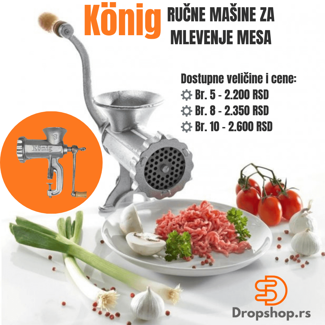 Ručne mašine za mlevenje mesa König predstavljaju savršen spoj tradicije i kvaliteta. Izrađene od visoko kvalitetnog nerđajućeg čelika i pocinkovanog gusa (liva), ove mašine su izuzetno izdržljive i dugotrajne. Tradicionalan dizajn sa drvenom ručkom omogućava lako okretanje i udobno korišćenje, dok je jednostavno rastavljanje idealno za brzo i lako čišćenje.